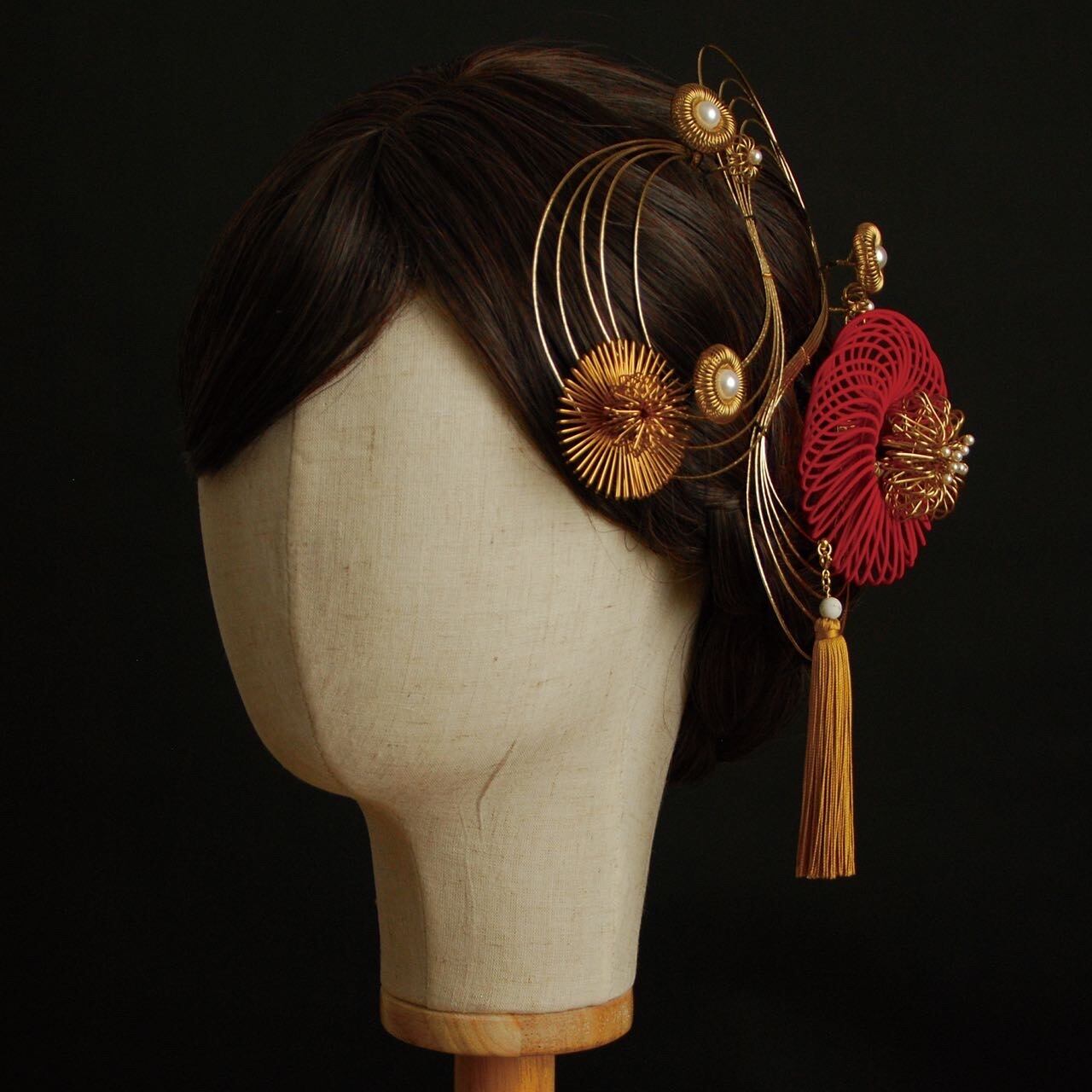 ゴールドカラーの水引90cmを使用した髪飾りです。