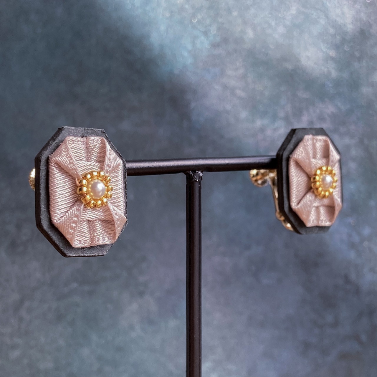 リボンやクリスタルパール・ビーズを使って紙に刺繍をした耳飾り。