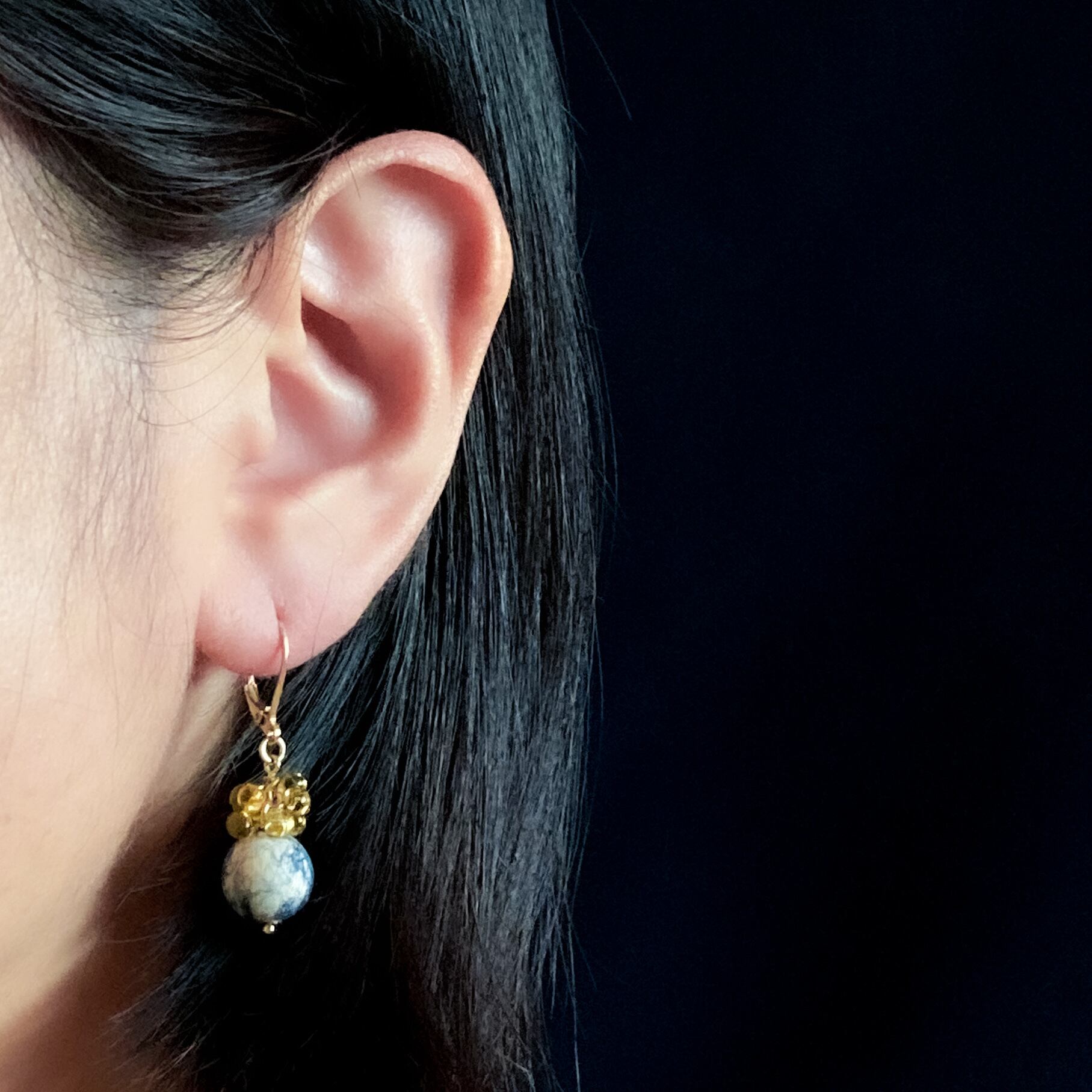 木のパーツに白石和紙を薄くかぶせ、アンバー色のビーズと組み合わせた耳飾り。